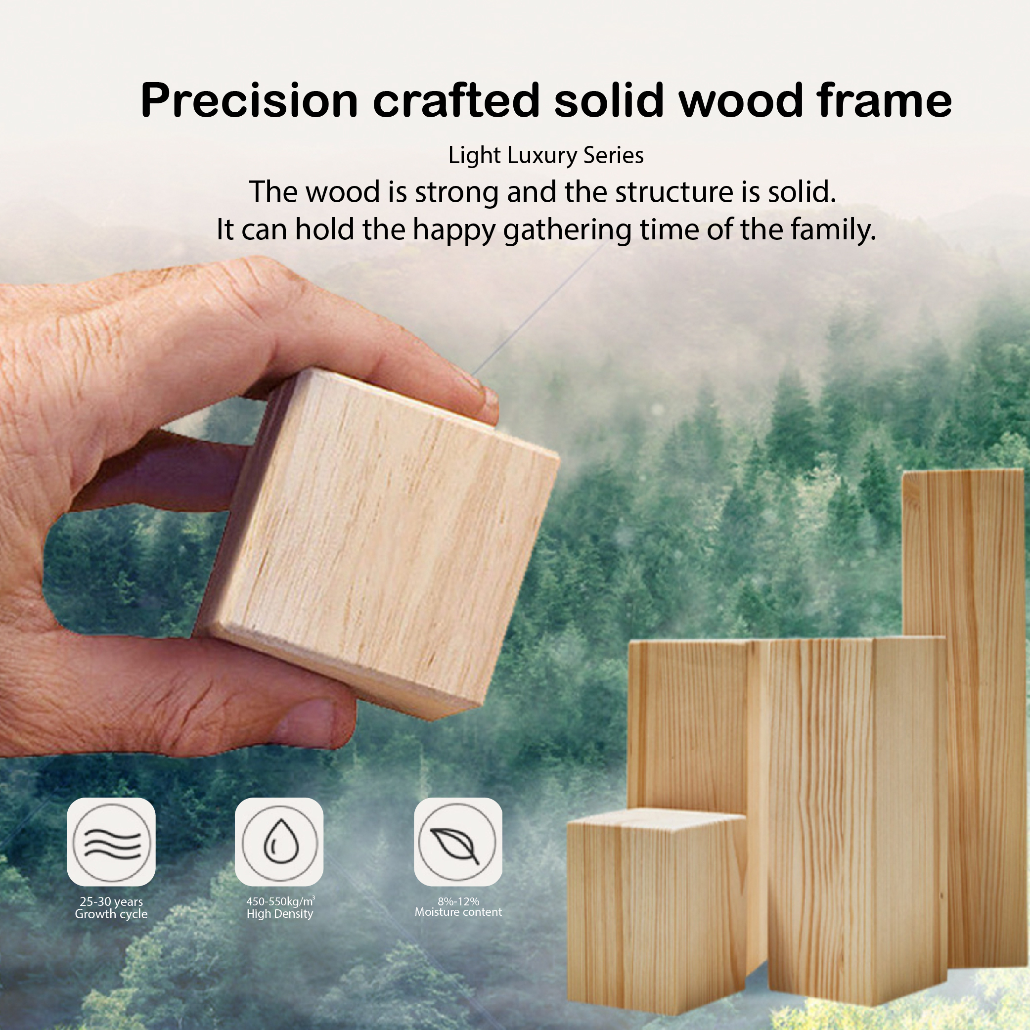 Imported rubberwood with a solid wood base, strong and stable.