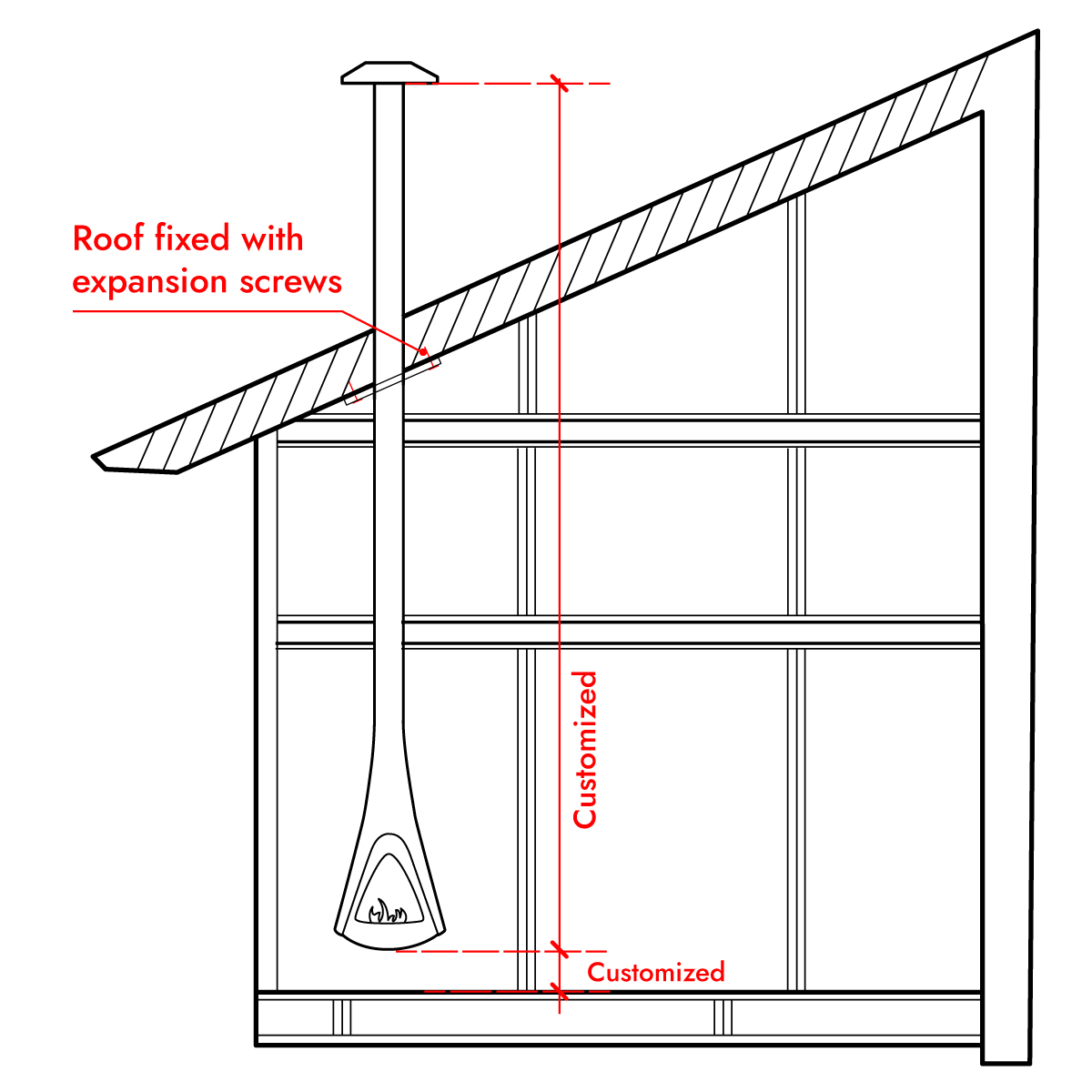 - Use expansion bolts to secure the fireplace to the ceiling.