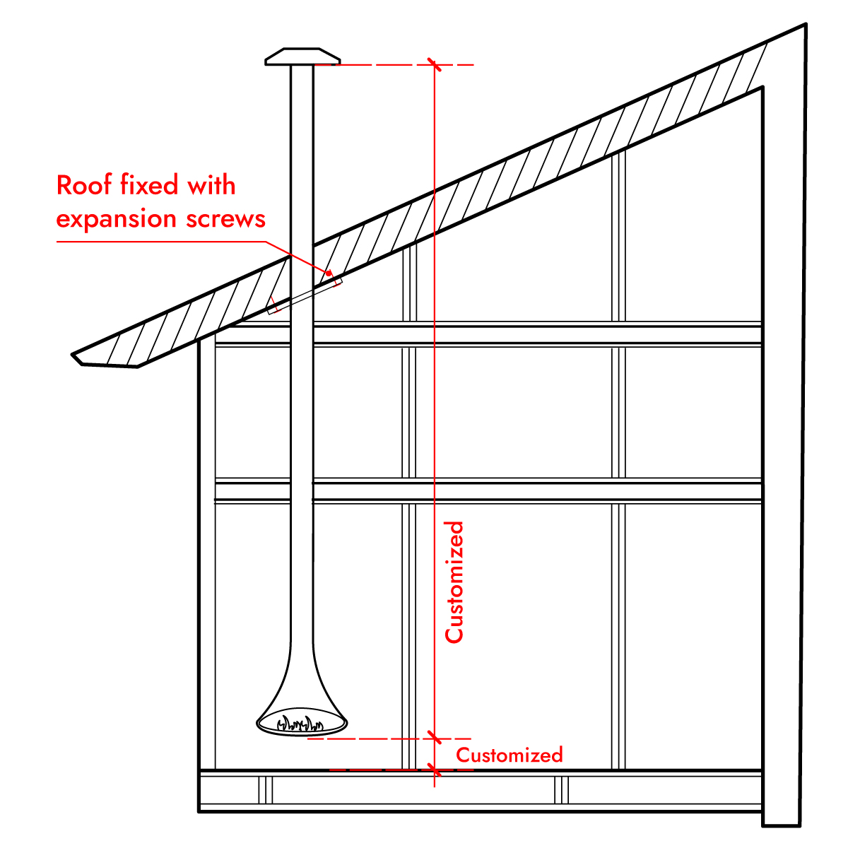 - Use expansion bolts to secure the fireplace to the ceiling.